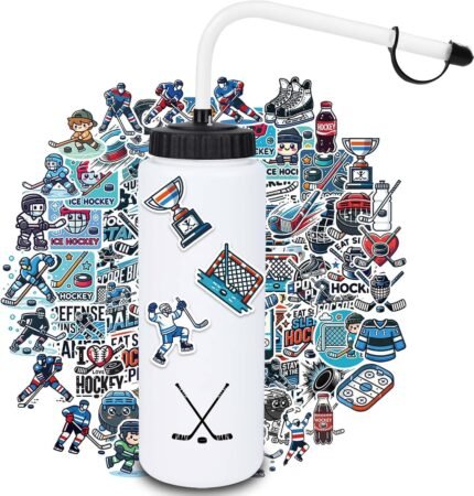 RhythmFit Hockey Gifts,1 Pack Hockey Water Bottle with Long Straw and 100PCS Stickers Accessories Stuff for Boys Men Player Lovers (1L,Squeeze,BPA-Free)