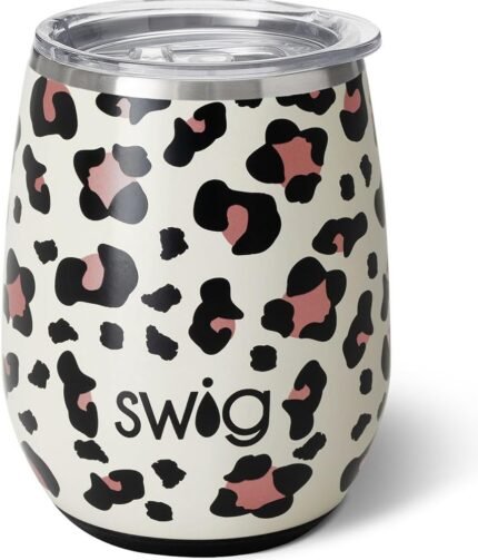 Swig Life 14oz Stemless Wine Cup, Insulated Wine Tumbler with Lid, Stainless Steel Travel Tumbler (Luxy Leopard)