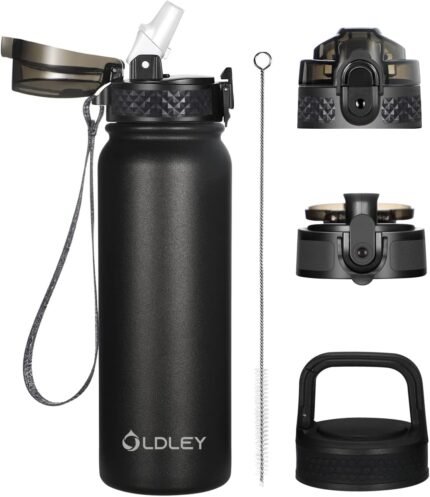 Oldley Insulated Water Bottle 20oz Water Bottles with Straw, Stainless Steel Water Bottle with 3 Lids, Double Wall Vacuum Bottles for Adult Kids, Sports Bottles for School Travel, Black