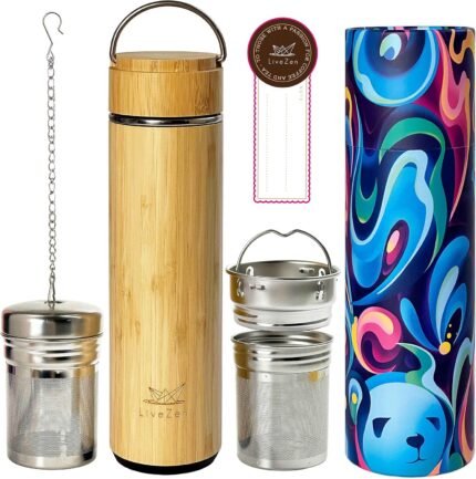 LiveZen 18oz Bamboo Tea Tumbler with Lid and 2 Pack Tea Filters for Loose Leaf Tea – Stainless Steel Insulated Tea Infuser Bottle with Strainer – Tea Gift Set for Tea Lovers Men Women