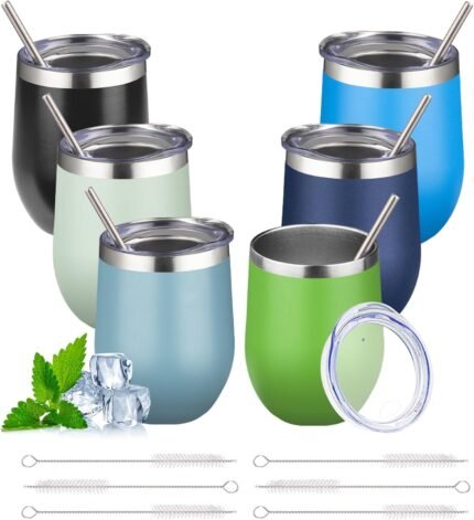 12oz Stemless Wine Tumbler with Lid Double Wall Insulated Wine Cup Stainless Steel Glasses Tumbler with Straw Insulated cocktail Tumbler Coffee Mug for Hot and Cold Beverages (Multicolor-10,6Pack)