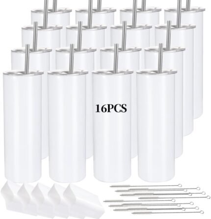 16 Pack Sublimation Tumblers Edge Blanks Skinny Straight Bulk 20 oz, Stainless Steel Double Wall Insulated Tumbler with Straw & Lids for Heat Transfer, White