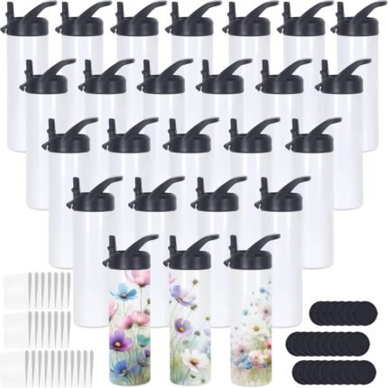 oaptuza 20 Oz Sublimation Tumbler Bulk Skinny Straight, 25 Pack Sublimation Water Bottles Blanks with Handle Straw Lid, Insulated Stainless Steel Tumbler Cup for Heat Transfer