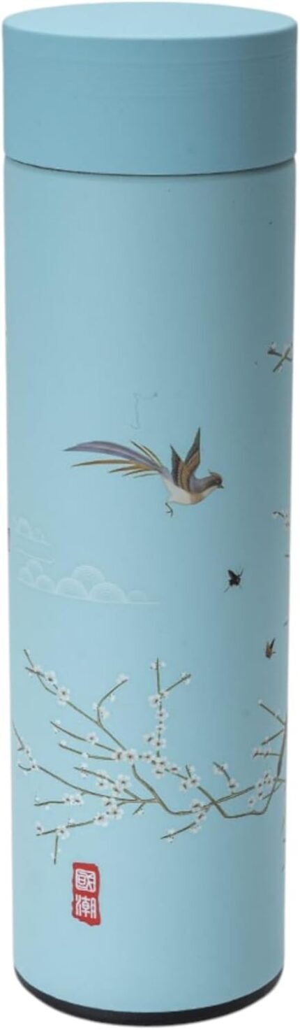Urban Tokyo Vacuum Insulated Coffee Tea Travel Thermal Flask Water Bottle with Removable Strainer Featuring Elegant Asian Art Design 16.9 fl oz (Light Blue)