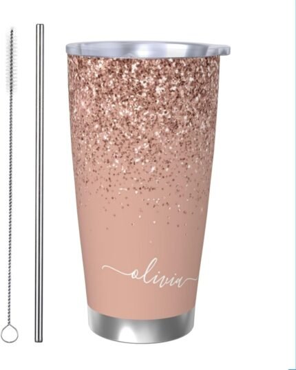 Blush Pink Rose Gold Glitter 20oz Tumbler Stainless Steel Vacuum Insulated Coffee Travel Mug, Durable Insulated Coffee Travel Mug with Splash-Proof Lid Metal Straw and Brush Thermal Cup for Outdoor