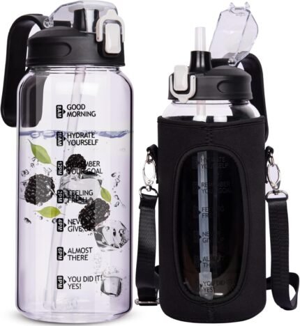 64 oz Motivational Glass Water Bottle with Straw & Time Marker Half Gallon Large Reusable Water Jug BPA-free Borosilicate Drinking Bottle with Flip Top & Sleeve for Infused Water Wide Mouth
