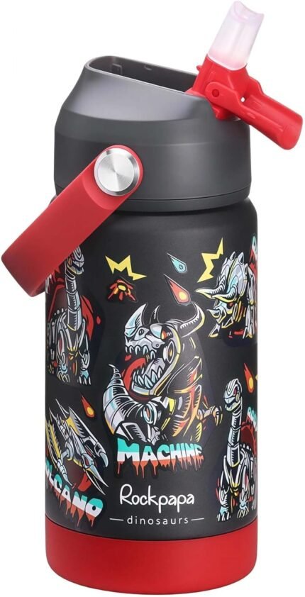 rockpapa 14 oz Kids Insulated Water Bottle,Stainless Steel Toddler Cups with Straws, BPA Free, Leak-Proof, Kids Water Bottle for School Boys&Girls (Black Dinosaur)