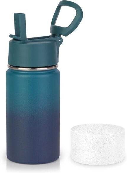 Volhoply 14oz KIds Stainless Steel Insulated Leakproof Water Bottle with Straw Lid and Silicone Boot,BPA-Free Easy Use for Boys&Girls,Double Wall Vacuum Bottles(Blue Green,1)