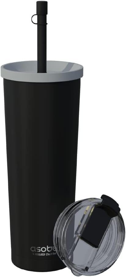 asobu Ocean Stainless Steel Tumbler with Flexible Straw Lid | Insulated Water Bottle for Ice Coffee, Cold Brew | Flip Open Lid for Hot Tea and Coffee | Reusable Travel Cup 27 Ounce (Black)