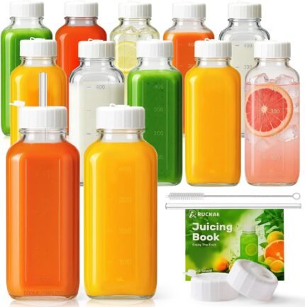 Ruckae 16oz 12 Pack Glass Juice Bottles with Lids – Reusable Square Glass Juice Bottles with Leak-Proof Lid & Capacity Marks for Containers Juicing,Milk,Smoothies