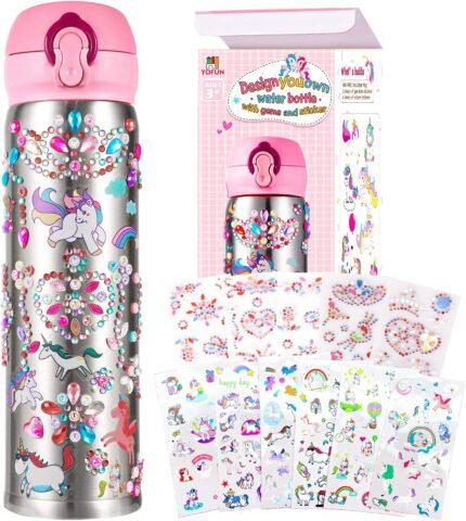 YOFUN Decorate Your Own Water Bottle with 11 Sheets of Unicorn Stickers & Glitter Gems, Craft Kit & Art Kit for Children, Gift for Girls Age 4 5 6 7 8 9 10 Years Old Kids, BPA Free Insulated (Silver)