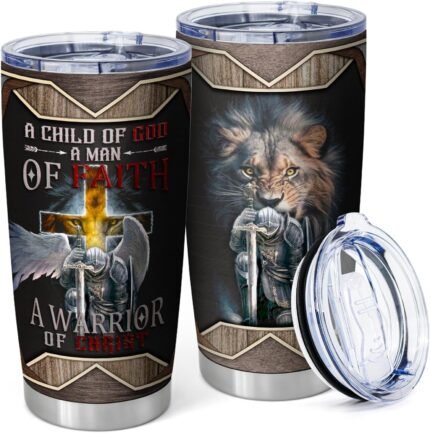 Equoza Christian Faith Tumbler for Men, Dad, Husband, Grandpa Warrior Of God Faith Tumbler 20 oz Stainless Steel Travel Mugs with Lids,Christian Gifts for Men