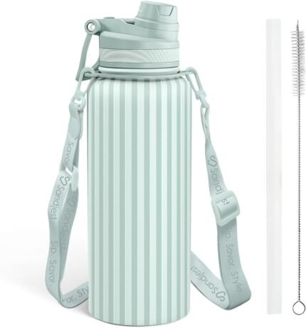 Stripe Stainless Steel Water Bottle with Strap 32oz, Insulated Bottles with Straw and Spout Lid for Gym Sports Travel Outdoor, Gifts for Women Girls Birthday Christmas