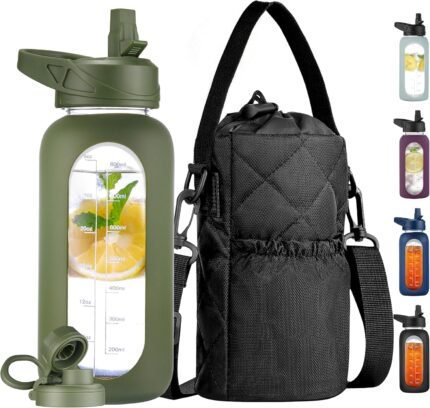 CIVAGO 32 oz Glass Water Bottle with Straw and Insulated Bottle Holder Sling, Motivational Water jug with Time Marker and Silicone Sleeve, Water Flask with 2 Lids for Walking and Gym Army Green