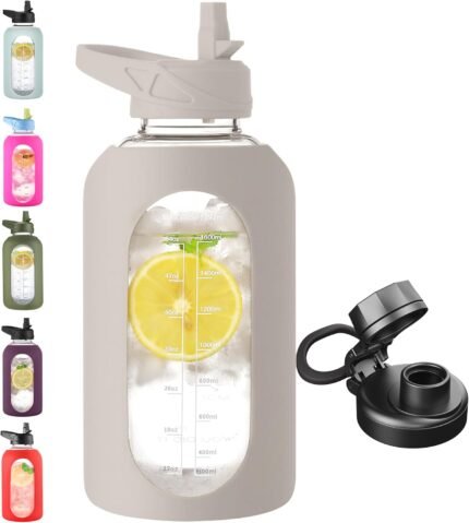 CIVAGO 64 oz Glass Water Bottle Jug with Straw and Handle, Half Gallon Sports Motivational Water Bottle with Time Marker, Wide Mouth Flask Canteen with Silicone Sleeve for Gym, Apricot