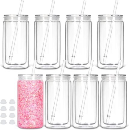 8 Pack plastic Snow Globe Tumbler, 16 Oz Double Wall Plastic Can with Lid and Straw, Plastic Mason Jar Mug for Snow Globe Glitter DIY Gift (Clear)