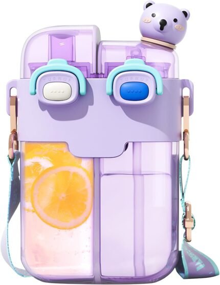 Cute Water Bottle for Girls, 26oz Kawaii Water Bottle with Compartment, Kids Bottles with Straw and Strap, BPA-Free, Leak-Proof Plastic Drinking Cup, Gift for Kids & Girls (Purple)