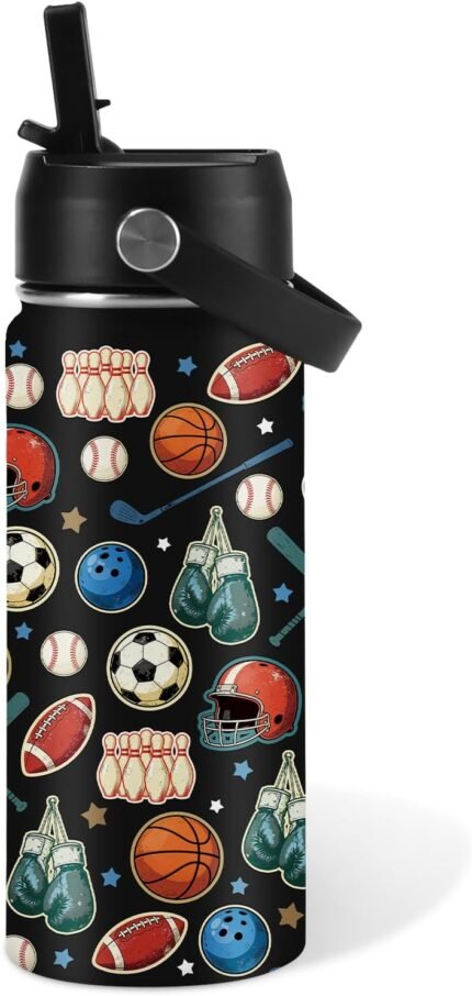 Sport Gift for Kids – 16oz Kids Water Bottle with Straw Lid, Stainless Steel Insulated Bottle, Leak Proof, BPA-Free, Sport Balls Water Bottles for Boy & Girls, School, Children Birthday Gift Cup(1pc)