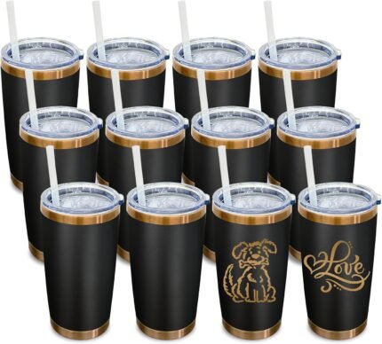 20 oz Tumbler Bulk 12 Pack Stainless Steel Tumbler with Lid and Straw, Double Wall Vacuum Insulated Travel Coffee Mug for Laser Engrave, Powder Coated Cup for Hot and Cold Drinks (Black,12 pack)