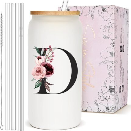 Monogrammed Personalized Customized Gifts for Women, Cute Glass Cups with Lids and Straws, Custom Letter Mug Tumbler, Initial Iced Coffee Cup Drinking Glasses, Cool Coffee Lover Gifts for Women, D
