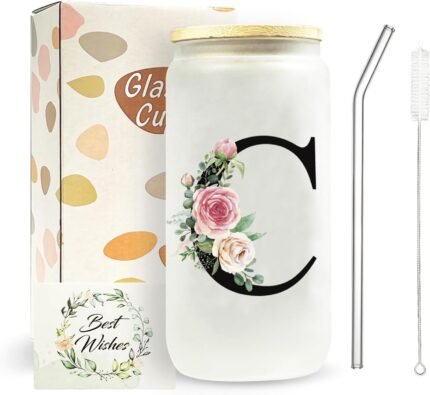 Personalized Gifts for Women,16 oz Custom Mug, Monogrammed Initial Glass Cups with Lids and Straws, Cute Glass Coffee Tumbler, Personalized Gifts for Christmas, Birthday (C)