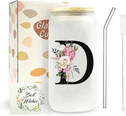 Personalized Gifts for Women,16 oz Custom Mug, Monogrammed Initial Glass Cups with Lids and Straws, Cute Glass Coffee Tumbler, Personalized Gifts for Christmas, Birthday (D)