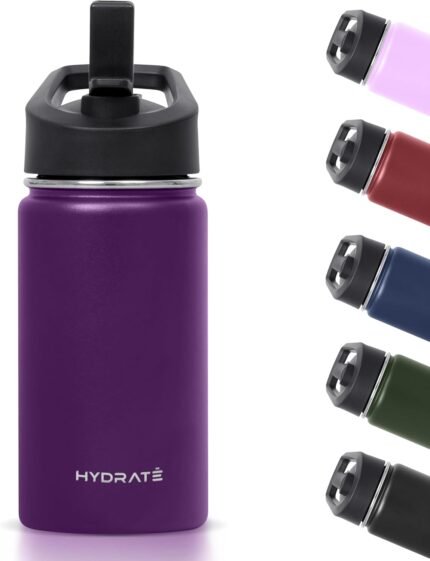 Hydrate Kids Water Bottle – 14oz Insulated Thermal Tumbler with Leak-Proof Folding Straw Lid – Keeps Drinks Cold or Warm for 6–12 Hours – Durable, BPA-Free – Easy Carry – Dark Purple