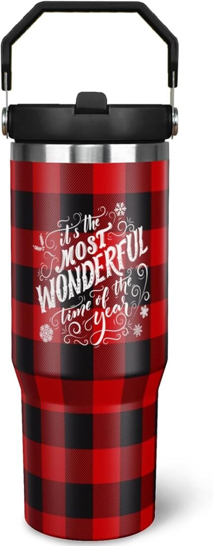 Price: (as of – Details) 30oz Christmas Tumbler with Handle and Straw, Stainless Steel Vacuum Insulated Flip Straw 30 oz