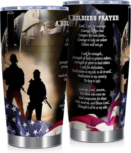 Patriotic Tumbler,20oz Insulated Stainless Steel Coffee Travel Mug with Lid, USA Flag A Soldier’s Prayer Tumbler Gift for Army Veterans, Men, Dad, Grandpa on Veterans Day