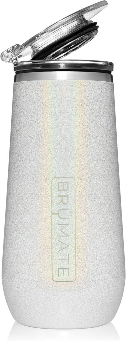 BrüMate Champagne Flute 12oz with Flip-Top Lid to Hold in Carbonation | Insulated Stainless Steel for Ice Cold Champagne | BPA-Free (Glitter White)