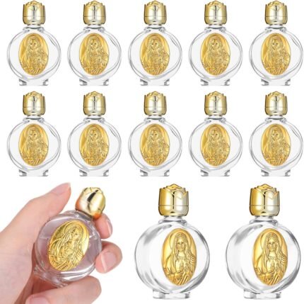 KOMI 12PCS Glass Holy Water Bottle 0.5 floz Mini Holy Water Container with Embossed Madonna and Child Religious Empty Travel Bottle Church Catholic Gifts