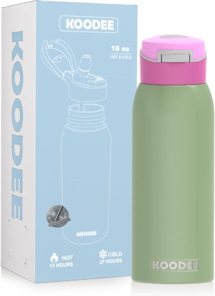 koodee Kids 16oz Free-sip Insulated Stainless Steel Water Bottles with Soft Straw,Quick Flip GO Bounce Cup Thermo-flask,Pop & Fill Double-Wall Vacuum Bottle, for School, Sports,Travel(Pink Avocado)