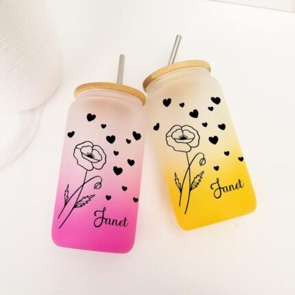 Birth Flower Frosted Glass Tumbler with Lid Custom Birthflower Glass Water Bottle with Name Retirement Women’s Day Gifts for Colleague Flower Travel 16oz Iced Coffee Mug