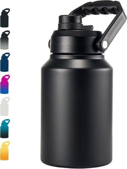 Insulated Half Gallon Jug, Large 64oz Stainless Steel Insulated Water Bottles with Handle, Double-Wall Vacuum Insulation for Construction Sites, Camping and Hiking, Black