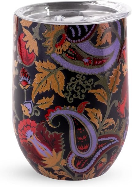 Insulated Wine Tumbler, 12 Ounce Travel Cup, Blue Stainless Steel Tumbler with Lid, Midnight Garden Paisley