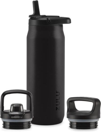 ZULU Base 32oz Stainless Steel Water Bottle with 3 Lids- Straw, Chug, Twist | Double Walled and Vacuum Insulated Metal Thermos | For Gym, Outdoor, Built in Carry Loop, Dishwasher Safe, Black
