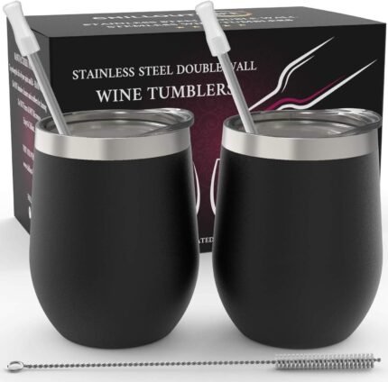 CHILLOUT LIFE 12 oz Stainless Steel Wine Tumblers 2 Pack – Double Wall Vacuum Insulated Wine Glasses Cups with Lids and Straws Set Keeping Cold & Hot for Coffee, Beer, Ice Cream – Powder Coated Black