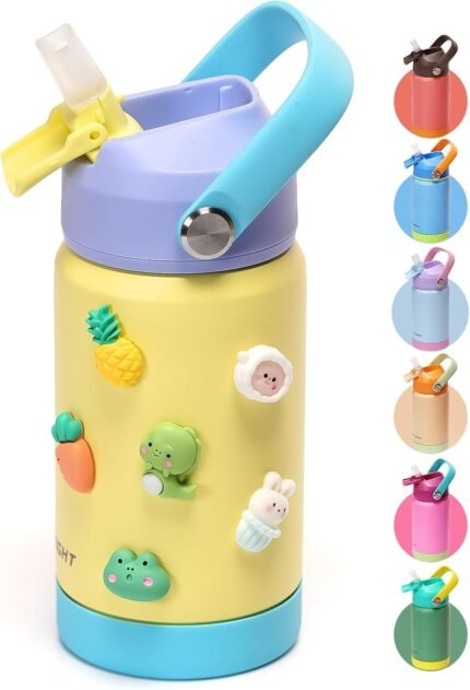 Kids Insulated Water Bottle, 12 oz BPA-FREE Double Wall Vacuum Tumbler 18/8 Stainless Steel Leak Proof Kids Cups with Straw for School Travel Boys Girls (Yellow)