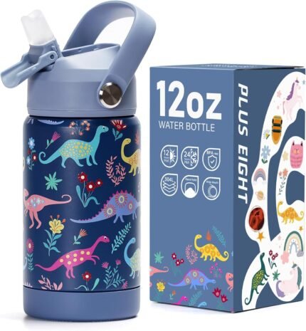 Kids Insulated Water Bottle with Straw Lid, 12 oz BPA-FREE Double Wall Vacuum Tumbler 18/8 Stainless Steel Leak Proof Kids Cups with Straw for School Travel Boys Girls (Dinosaur)