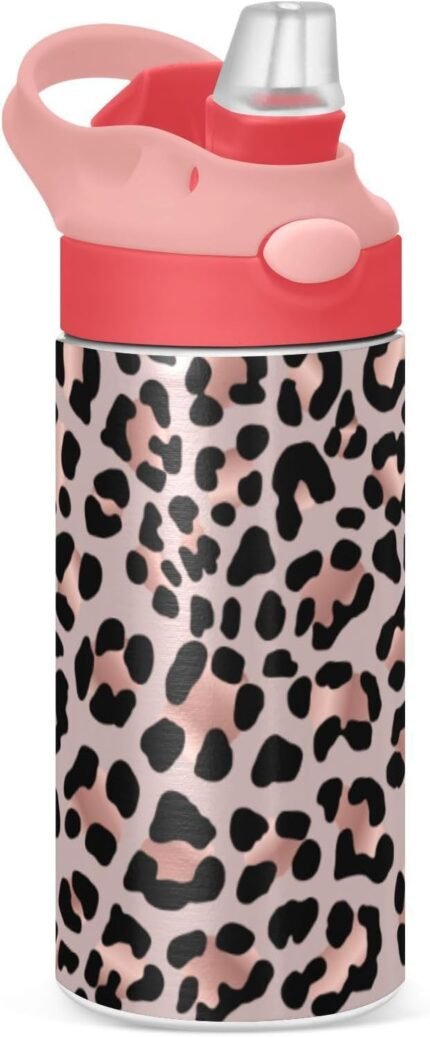 ALAZA Leopard Print Cheetah Kids Water Bottles with Lids Straw Insulated Stainless Steel Water Bottles Double Walled Leakproof Tumbler Travel Cup for Girls Boys Toddlers 12 oz,Pink