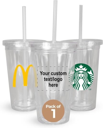 Set of Custom Clear Acrylic Tumblers 16oz, Personalized Bulk Pack Insulated Plastic Promotional Tumblers BPA Free, Perfect for Iced Coffee, Soda, Hot Drinks & Cold, Double Wall Logo (1 Count)