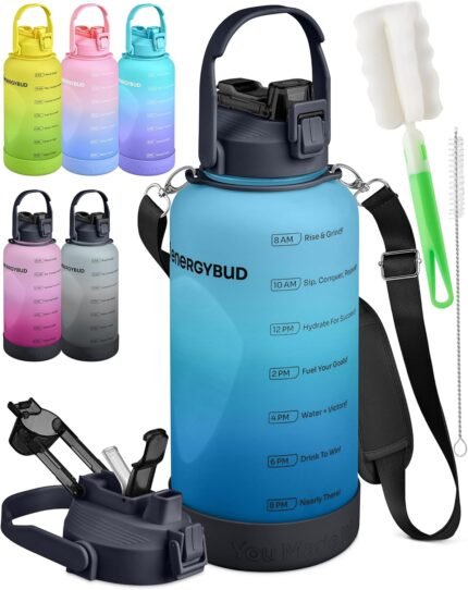 EnergyBud 1/2 Gallon Water Bottle with 74.3 oz Capacity – Motivational Time Markers for Daily Hydration Goals – Leakproof BPA Free Tritan with Removable Straw