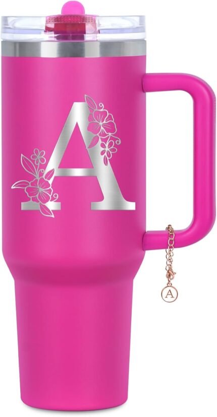 Personalized 40 oz Monogrammed Tumbler with Handle and Flip Straw Lid, 100% Leak Proof stainless steel Insulated Tumbler, Customized Initial Funny Gifts for Women Mom Sisters Coworker, A