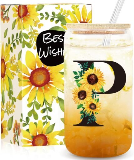 Frerdui Birthday Gifts for Women, Initial Glass Cups w Lids and Straws, Sunflower Gift for Women, Personalized Gift, 16oz Glass Tumbler Cups W/Straw Lid, Monogrammed Birthday Gifts for Her Mom – P