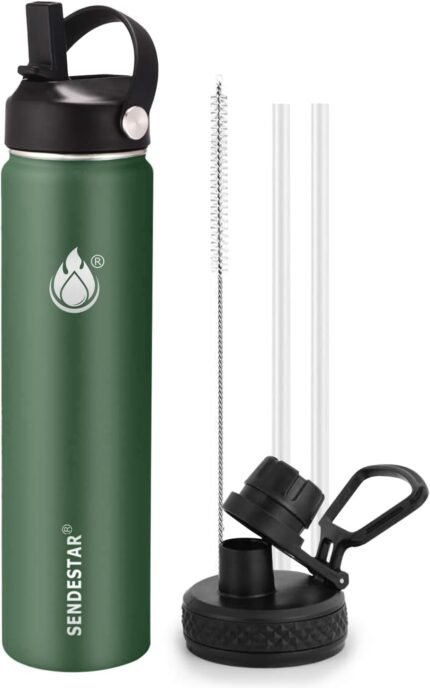 Insulated Water Bottle 24 oz with Straw, Stainless Steel Wide Mouth Water Bottle, Double Wall Vacuum Leak Proof with Straw Lid & Spout Lid for Sports or Office, Keep Cold or Hot Up to 24 Hrs