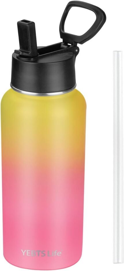 Insulated Water Bottle With Straw, 32 oz Vacuum Insulated Stainless Steel Sports Water Flask, Keeps Cold and Hot, Metal Water Bottle Wide Mouth for Gym Travel Camping (Yellow&Pink)