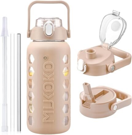 MUKOKO Glass Water Bottles 64oz with 2 Lids, Half Gallon Drinking Bottle with Straws and Measurements, 2L Sports Glass Jug with Silicone Sleeve, Leakproof, Light Amber