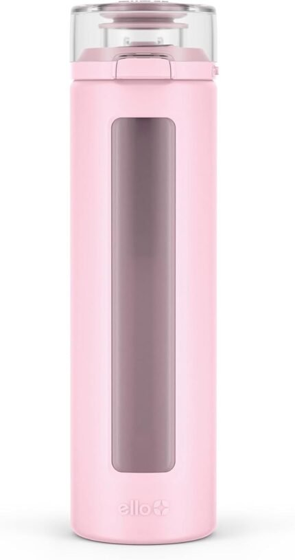 Ello Syndicate 20oz Reusable Glass Water Bottle with One-Touch Leak Proof Flip Lid, Protective Non-Slip Silicone Sleeve, Carry Loop for Coffee, Tea and Water, BPA-free, Dishwasher Safe, Cashmere Pink