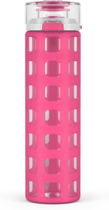 Ello Syndicate 20oz Reusable Glass Water Bottle with One-Touch Leak Proof Flip Lid and Protective Non-Slip Silicone Sleeve and Carry Loop for Coffee, Tea and Water, BPA-free, Dishwasher Safe, Pink