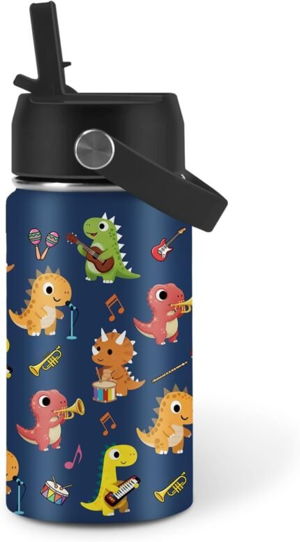 Music Dinosaur Water Bottle for Son, Stainless Steel Insulated Tumbler with Straw Lid and Handle, 12oz Reusable Leak-Proof Bottle for Sports